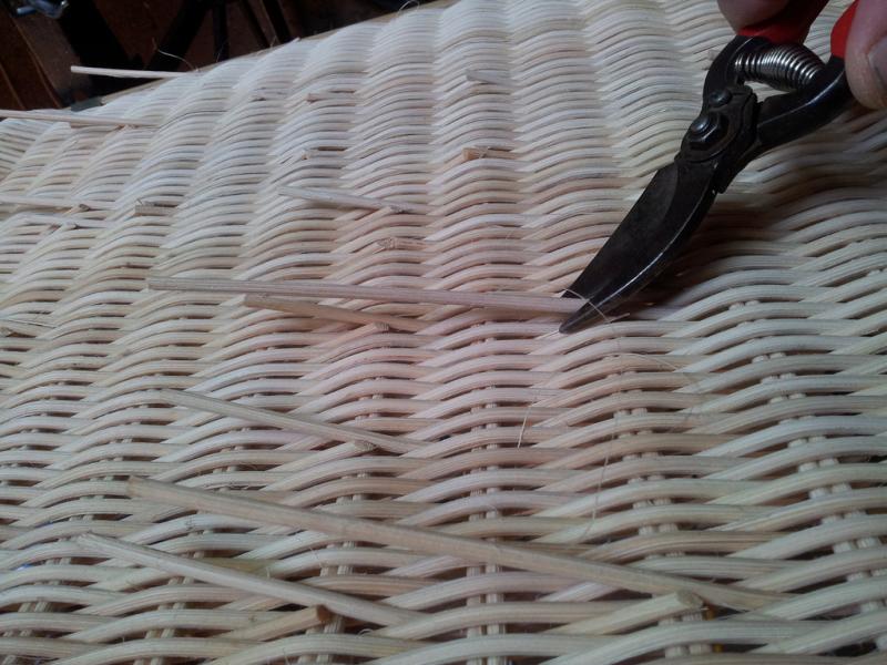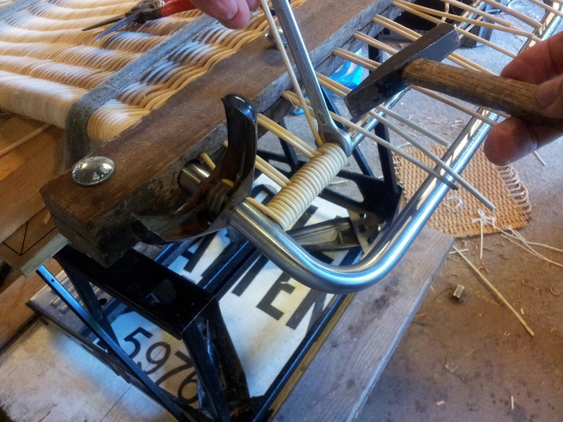 De schaar gaat erin. Begonnen wordt er met het omwikkelen van de onderbuis. Het begin van de inslag. Bij de tussenbuis moet je een slag overslaan. De inslag is bijna klaar. Nu moet de bovenbuis nog omwikkeld worden. Tussen inslag en omwikkeling ligt een kim van voor 2 achter 1 Dan alles mooi afknippen. En de Gispen Deckchair kan weer 25 jaar mee !
